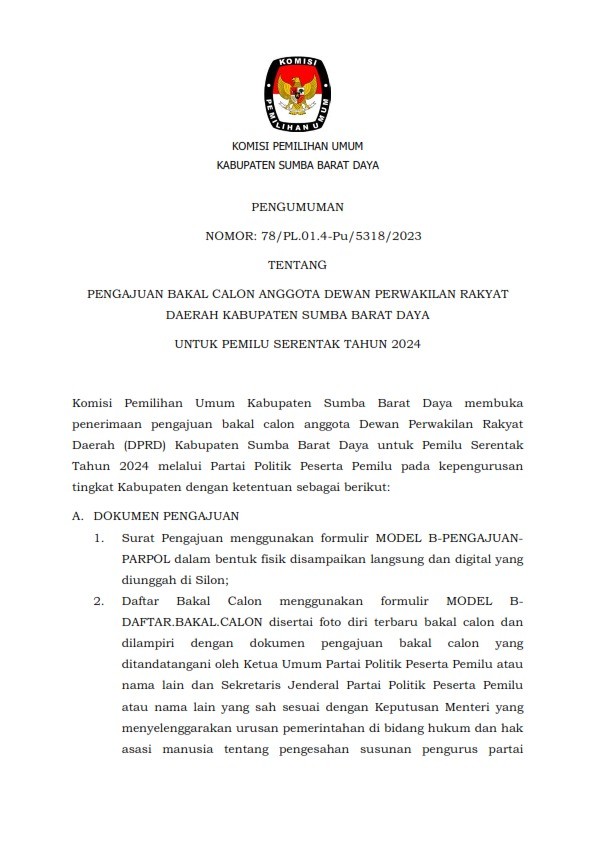 Bahwa berdasarkan Pasal 12 Peraturan Komisi Pemilihan Umum Nomor 15 Tahun 2023 tentang Kampanye Pemilihan Umum, Maka Komisi Pemilihan Umum Kabupaten Sumba Barat Daya mengumumkan Tim Kampanye Pasangan Calon Presiden dan Wakil Presiden Tingkat Kabupaten Manggarai Barat untuk Pasangan Calon: