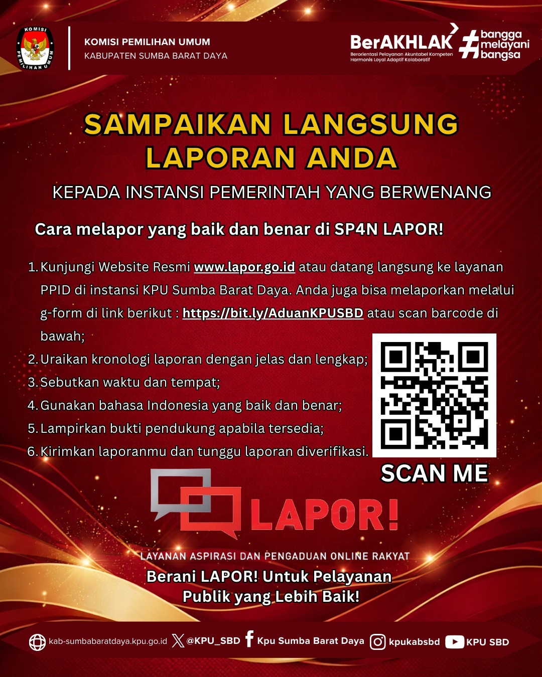 Atau datang langsung untuk dapat melakukan pengaduan ke Kantor KPU Kabupaten Sumba Barat Daya , Jl.Poma, Desa Kadipada,Tambolaka.